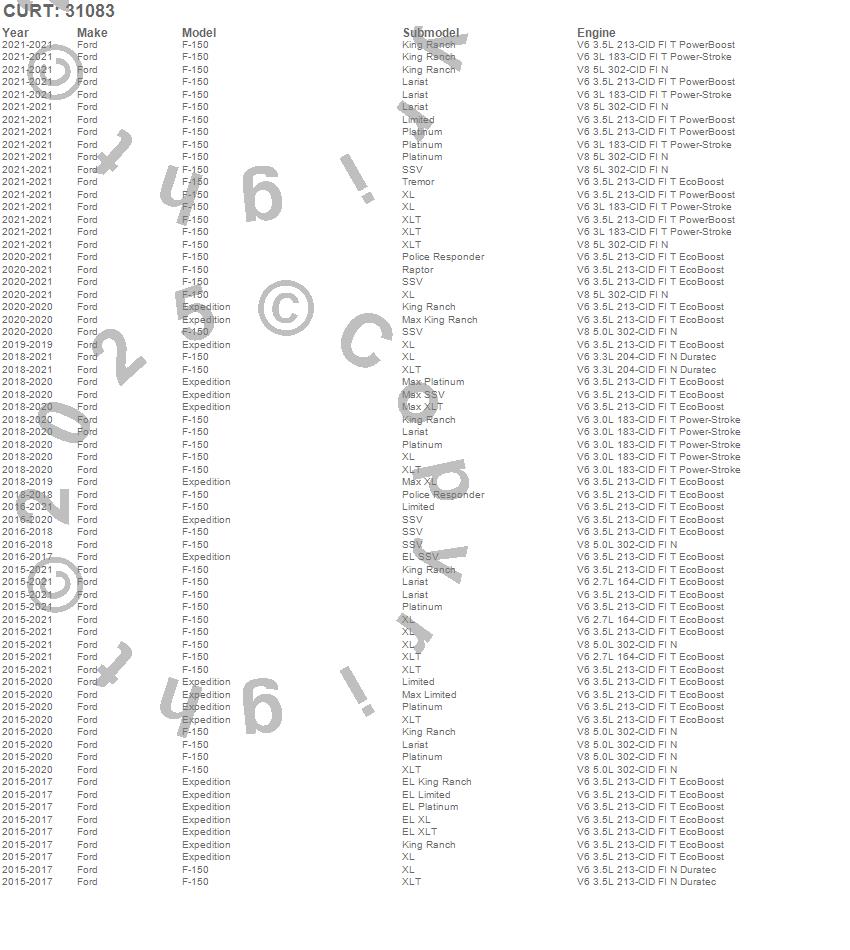 Below is an abbreviated list of applications for the 2 in. Receiver Hitch.Expedition, F-150, Ford, 2021, 2020, 2019, 2018, 2017, 2016, 2015