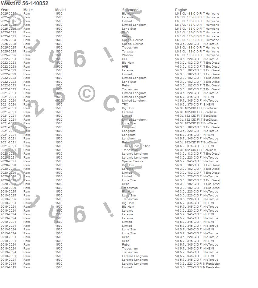 Brand: WestinPart Number: 56-140852Nerf/Step Bar Type: Textured Black Powder Coated Steel - Mount Kit IncludedUPC: 707742090022