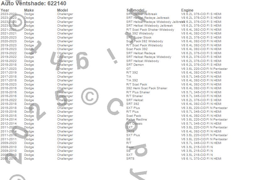 Below is an abbreviated list of applications for the Aeroskin Chrome Hood Protector.Challenger, Dodge, 2023, 2022, 2021, 2020, 2019, 2018, 2017, 2016, 2015, 2014, 2013, 2012, 2011, 2010, 2009, 2008
