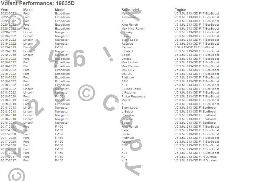 Below is an abbreviated list of applications for the Cold Air Intake Kit.Expedition, F-150, Navigator, Ford, Lincoln, 2022, 2021, 2020, 2019, 2018, 2017