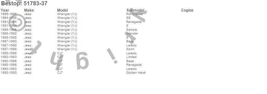 Brand: BestopPart Number: 51783-37Door Type: Spice - 2 pc. - Front - Fits PN[51603/51698/53818]UPC: 077848049096