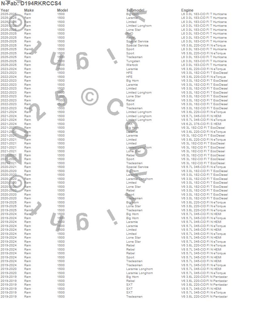Brand: N-FabPart Number: D194RKRCCS4Nerf/Step Bar Type: 1.75 in. Rails - 2 Step Mounts/2 Steps Per Side - Textured BlackUPC: 843206126934