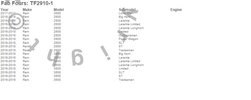 Brand: Fab FoursPart Number: TF2910-1Fender Flare Type: Open 2 Stage Black Powder CoatedUPC: 005810115777
