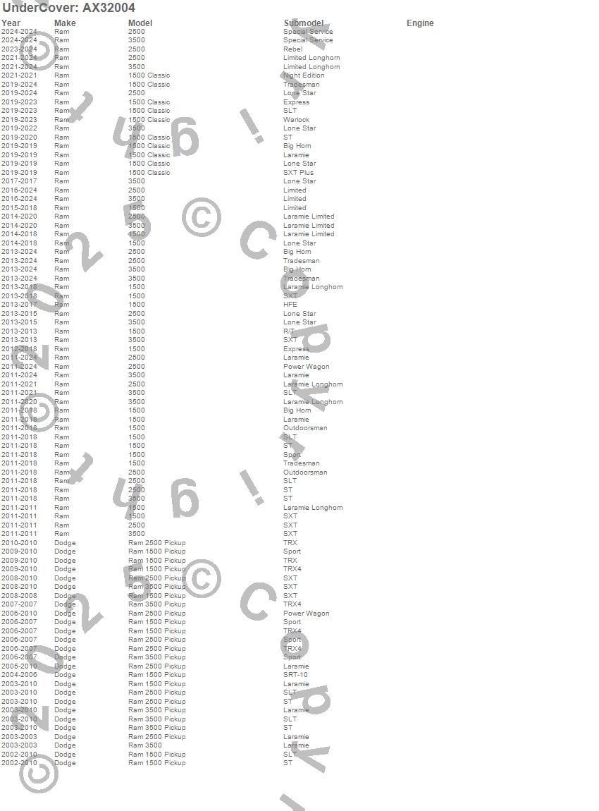 Brand: UnderCoverPart Number: AX32004Tonneau Cover Type: Black Textured - Will Not Fit Ram BoxUPC: 816391026624