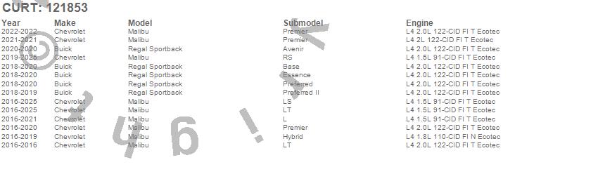 Below is an abbreviated list of applications for the Class II 1.25 in. Receiver Hitch.Malibu, Regal Sportback, Buick, Chevrolet, 2025, 2024, 2023, 2022, 2021, 2020, 2019, 2018, 2017, 2016