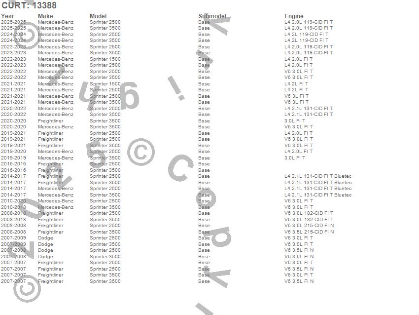 Below is an abbreviated list of applications for the Class III 2 in. Receiver Hitch.Sprinter 1500, Sprinter 2500, Sprinter 3500, Dodge, Freightliner, Mercedes-Benz, 2025, 2024, 2023, 2022, 2021, 2020, 2019, 2018, 2017, 2016, 2015, 2014, 2013, 2012