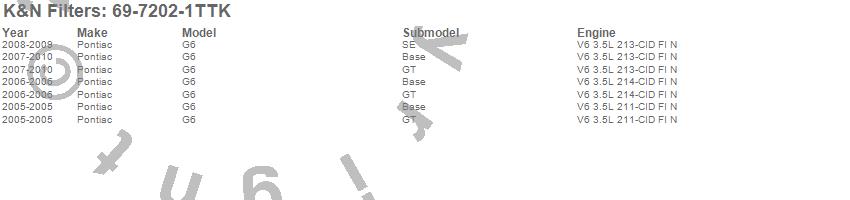Below is an abbreviated list of applications for the Typhoon Cold Air Induction Kit.G6, Pontiac, 2010, 2009, 2008, 2007, 2006, 2005