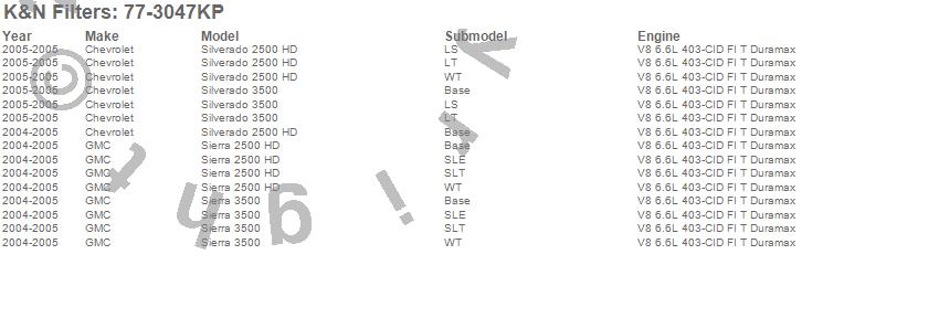 Below is an abbreviated list of applications for the Performance Induction Kit.Sierra 2500 HD, Sierra 3500, Silverado 2500 HD, Silverado 3500, Chevrolet, GMC, 2005, 2004