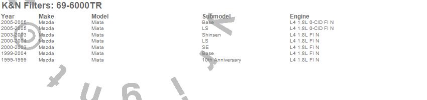 Below is an abbreviated list of applications for the Typhoon Short Ram Cold Air Induction Kit.Miata, Mazda, 2005, 2004, 2003, 2002, 2001, 2000, 1999