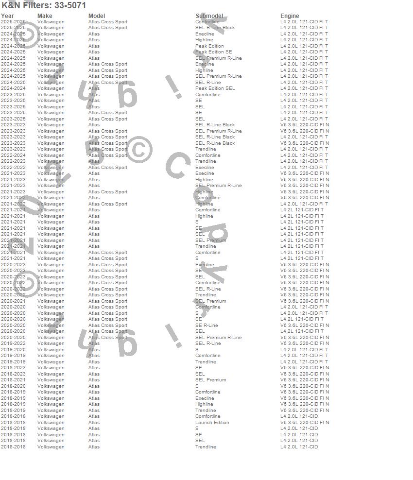 Below is an abbreviated list of applications for the Air Filter.Atlas, Volkswagen, 2019, 2018