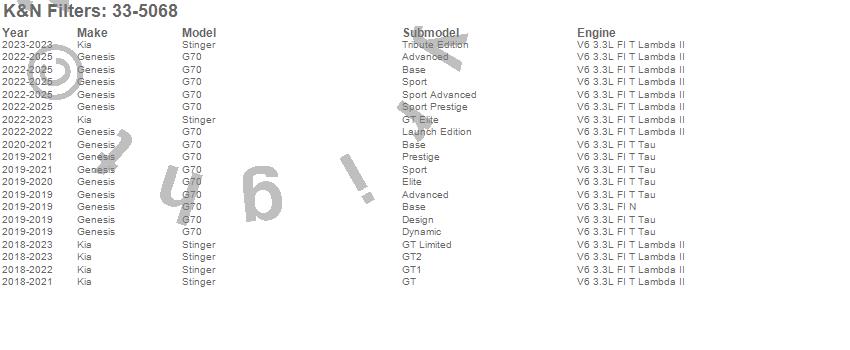 Below is an abbreviated list of applications for the Air Filter.G70, Stinger, Genesis, Kia, 2019, 2018