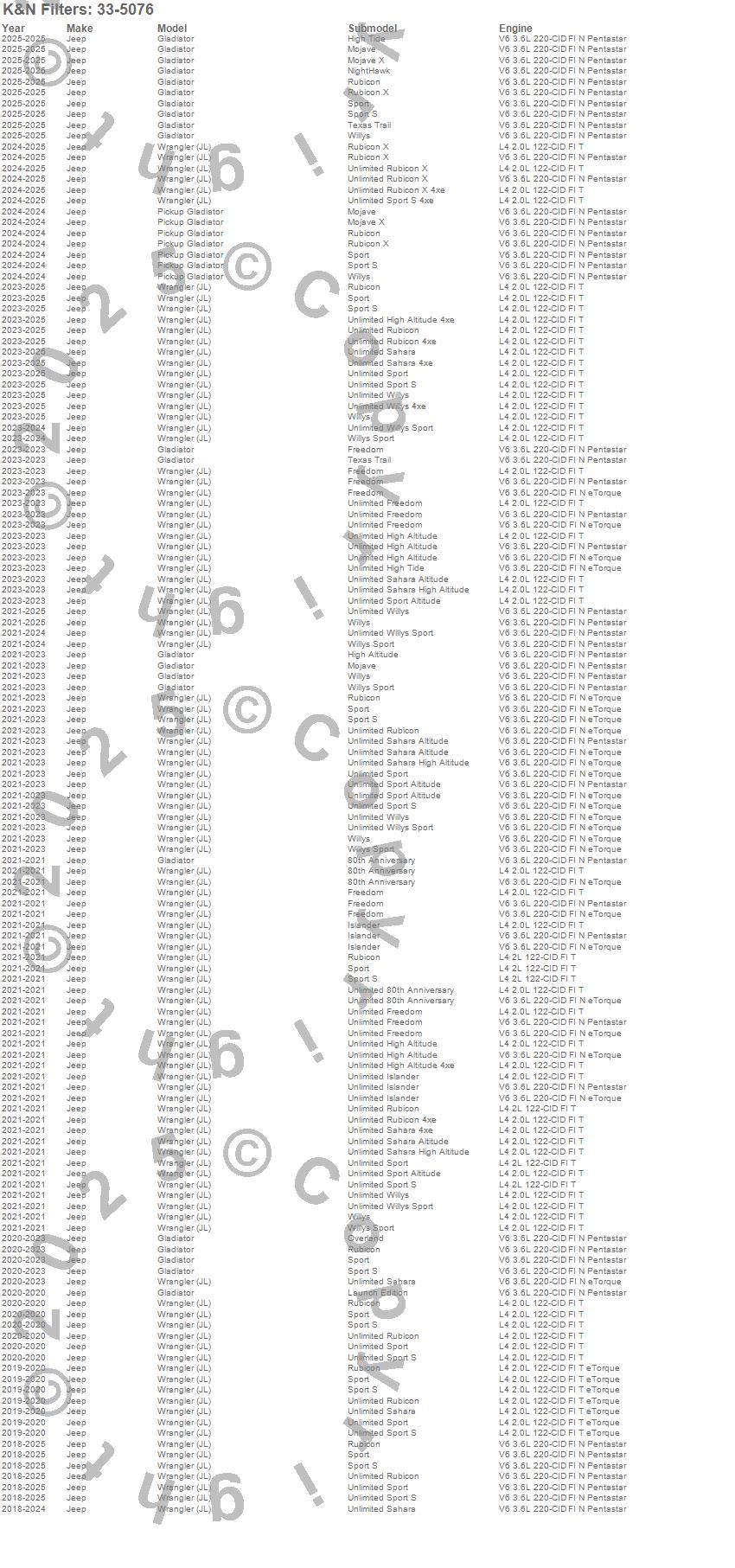 Below is an abbreviated list of applications for the Air Filter.Gladiator, Wrangler (JL), Jeep, 2020, 2019, 2018