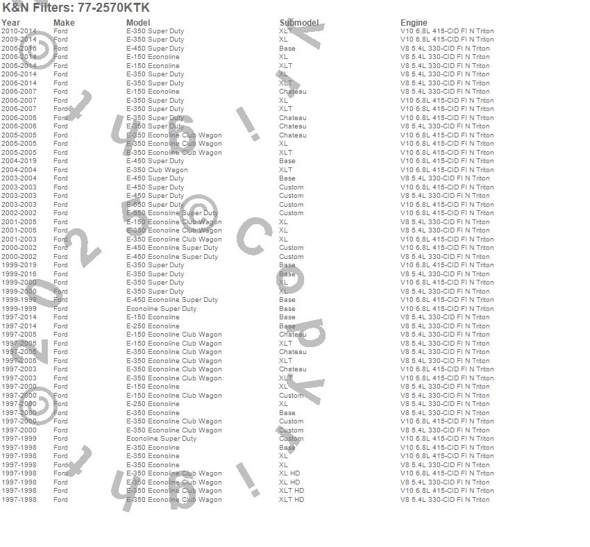 Below is an abbreviated list of applications for the Performance Induction Kit.E-150 Econoline, E-150 Econoline Club Wagon, E-250 Econoline, E-350 Econoline, E-350 Econoline Club Wagon, E-350 Super Duty, E-450 Econoline Super Duty, E-450 Super Duty, E-550 Econoline Super Duty, E-550 Super Duty, Ford, 2016, 2015, 2014, 2013, 2012, 2011, 2010, 2009, 2008