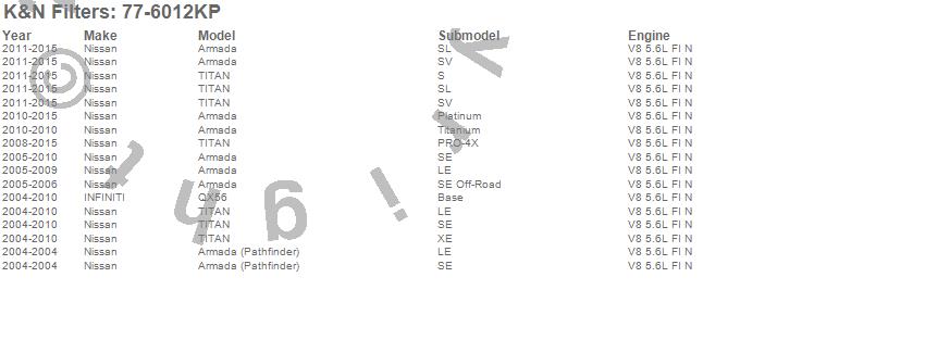 Below is an abbreviated list of applications for the Performance Induction Kit.Armada, Armada (Pathfinder), QX56, Titan, Infiniti, Nissan, 2015, 2014, 2013, 2012, 2011, 2010, 2009, 2008, 2007, 2006, 2005, 2004