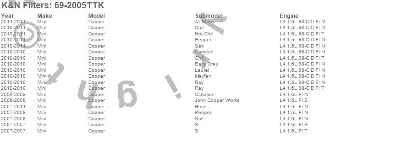 Below is an abbreviated list of applications for the Typhoon Cold Air Induction Kit.Cooper, Mini, 2011, 2010, 2009, 2008, 2007