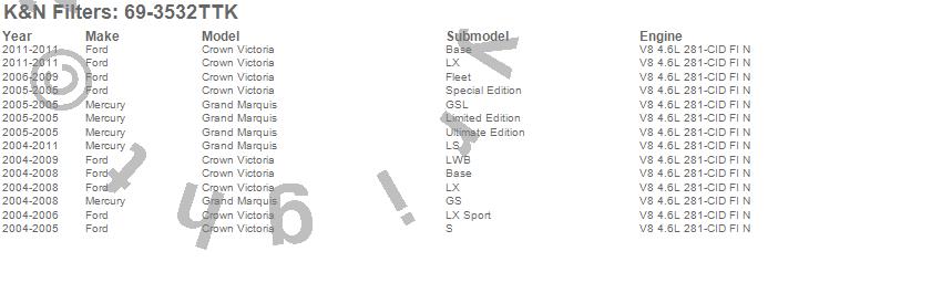 Below is an abbreviated list of applications for the Typhoon Cold Air Induction Kit.Crown Victoria, Grand Marquis, Ford, Mercury, 2011, 2010, 2009, 2008, 2007, 2006, 2005, 2004