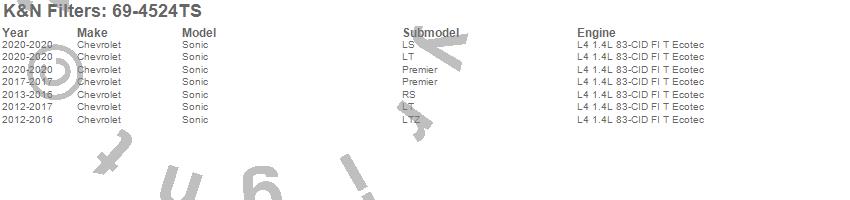 Below is an abbreviated list of applications for the Typhoon Cold Air Induction Kit.Sonic, Chevrolet, 2017, 2016, 2015, 2014, 2013, 2012