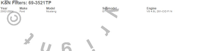 Brand: K&N FiltersPart Number: 69-3521TPAir Intake Kit Type: Incl. Red Air Filter/Polished Tubing/Heat Shield - Estimated Horsepower Gain 6.84 HP At 4600 RPMUPC: 024844109644