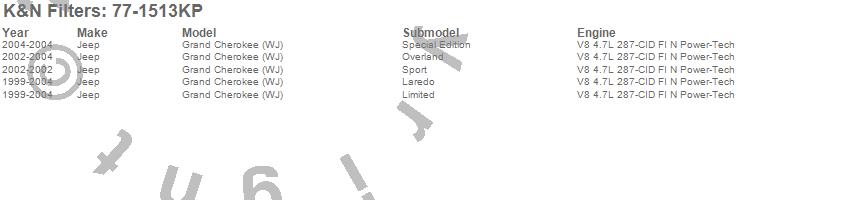Below is an abbreviated list of applications for the Performance Induction Kit.Grand Cherokee, Jeep, 2004, 2003, 2002, 2001, 2000, 1999