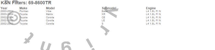 Below is an abbreviated list of applications for the Typhoon Short Ram Cold Air Induction Kit.Corolla, Matrix, Vibe, Pontiac, Toyota, 2004, 2003, 2002