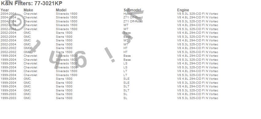 Below is an abbreviated list of applications for the Performance Induction Kit.Sierra 1500, Silverado 1500, Chevrolet, GMC, 2004, 2003, 2002, 2001, 2000, 1999