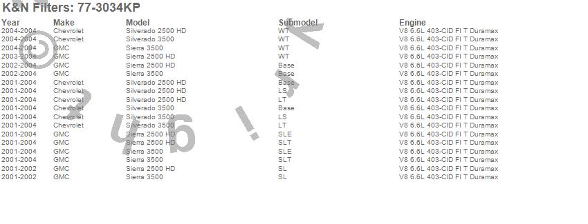 Below is an abbreviated list of applications for the Performance Induction Kit.Sierra 2500 HD, Sierra 3500, Silverado 2500 HD, Silverado 3500, Chevrolet, GMC, 2004, 2003, 2002, 2001