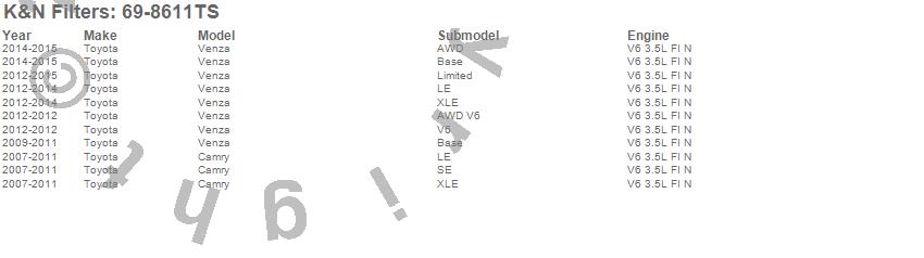 Below is an abbreviated list of applications for the Typhoon Cold Air Induction Kit.Camry, Venza, Toyota, 2015, 2014, 2013, 2012, 2011, 2010, 2009, 2008, 2007
