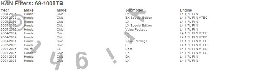 Below is an abbreviated list of applications for the Typhoon Short Ram Cold Air Induction Kit.Civic, EL, Acura, Honda, 2005, 2004, 2003, 2002, 2001