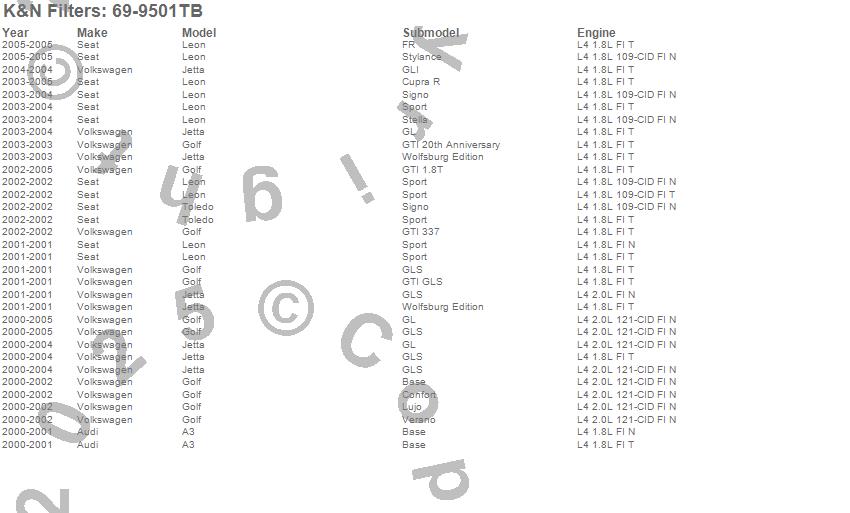 Below is an abbreviated list of applications for the Typhoon Complete Cold Air Induction Kit.A3, Golf, Jetta, Leon, Toledo, Audi, Seat, Volkswagen, 2005, 2004, 2003, 2002, 2001, 2000