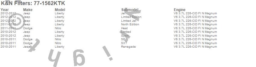Below is an abbreviated list of applications for the Performance Induction Kit.Liberty, Nitro, Dodge, Jeep, 2012, 2011, 2010