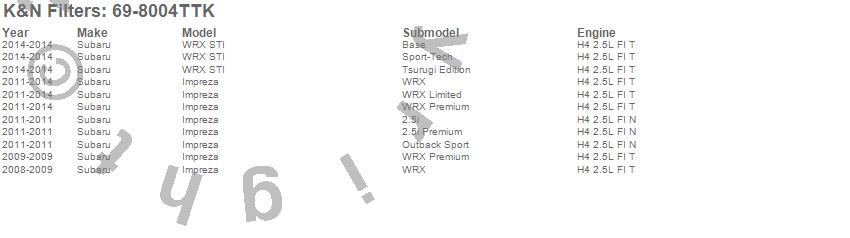 Below is an abbreviated list of applications for the Typhoon Cold Air Induction Kit.Impreza, WRX STI, Subaru, 2014, 2013, 2012, 2011, 2009, 2008
