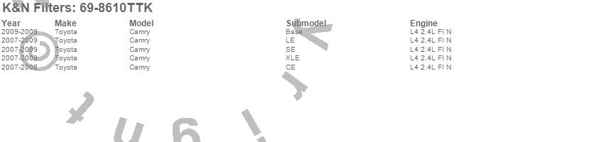 Brand: K&N FiltersPart Number: 69-8610TTKAir Intake Kit Type: Incl. Red Air Filter/Textured Black Tubing/Heat Shield - Estimated Horsepower Gain 14.26 HP At 5639 RPMUPC: 024844197559