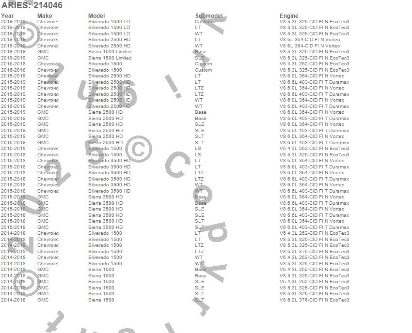 Below is an abbreviated list of applications for the 3 in. Round Side Bars.Sierra 1500, Sierra 1500 Limited, Sierra 2500 HD, Sierra 3500 HD, Silverado 1500, Silverado 1500 LD, Silverado 2500 HD, Silverado 3500 HD, Chevrolet, GMC, 2019, 2018, 2017, 2016, 2015, 2014