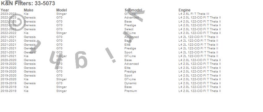 Below is an abbreviated list of applications for the Air Filter.G70, Stinger, Genesis, Kia, 2019, 2018