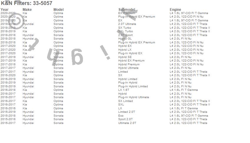 Below is an abbreviated list of applications for the Air Filter.Optima, Sonata, Hyundai, Kia, 2019, 2018, 2017, 2016, 2015
