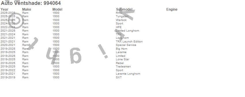 Below is an abbreviated list of applications for the Ventvisor Low Profile Deflector 4 pc..1500, Ram, 2025, 2024, 2023, 2022, 2021, 2020, 2019
