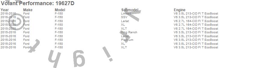 Below is an abbreviated list of applications for the Cold Air Intake Kit.F-150, Ford, 2020, 2019, 2018, 2017, 2016, 2015