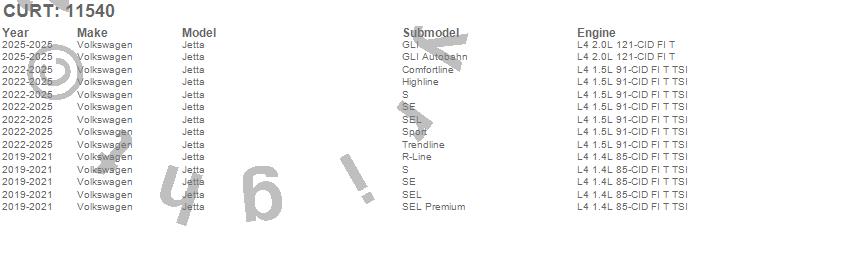 Below is an abbreviated list of applications for the Class I 1.25 in. Receiver Hitch.Jetta, Volkswagen, 2026, 2025, 2024, 2023, 2022, 2021, 2020, 2019