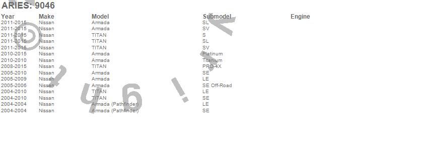 Below is an abbreviated list of applications for the Grille Guard.Armada, Armada (Pathfinder), TITAN, Nissan, 2015, 2014, 2013, 2012, 2011, 2010, 2009, 2008, 2007, 2006, 2005, 2004