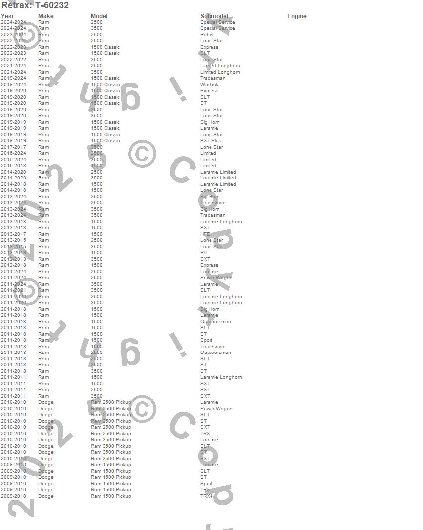 Below is an abbreviated list of applications for the RetraxONE XR Retractable Tonneau Cover.1500, 1500 Classic, 2500, 3500, Ram 1500, Ram 2500, Ram 3500, Dodge, Ram, 2024, 2023, 2022, 2021, 2020, 2019, 2018, 2017, 2016, 2015, 2014