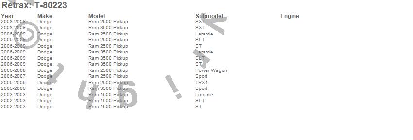 Below is an abbreviated list of applications for the RetraxPRO XR Retractable Tonneau Cover.Ram 1500, Ram 2500, Ram 3500, Dodge, 2009, 2008, 2007, 2006, 2003, 2002