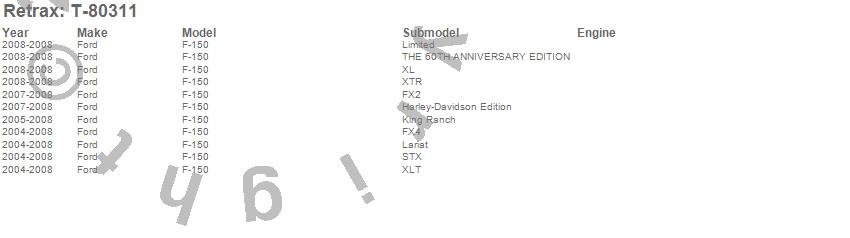 Below is an abbreviated list of applications for the RetraxPRO XR Retractable Tonneau Cover.F-150, Ford, 2008, 2007, 2006, 2005, 2004