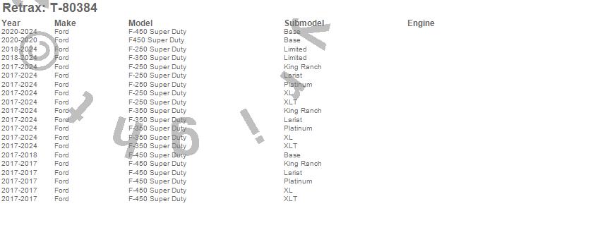 Below is an abbreviated list of applications for the RetraxPRO XR Retractable Tonneau Cover.F-250 Super Duty, F-350 Super Duty, F-450 Super Duty, F450 Super Duty, Ford, 2025, 2024, 2023, 2022, 2021, 2020, 2019, 2018, 2017