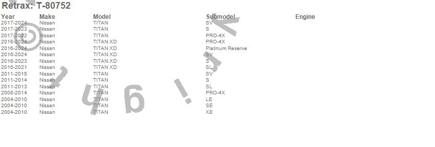Below is an abbreviated list of applications for the RetraxPRO XR Retractable Tonneau Cover.TITAN, TITAN XD, Nissan, 2024, 2023, 2022, 2021, 2020, 2019, 2018, 2017, 2016, 2015, 2014, 2013, 2012, 2011, 2010, 2009, 2008