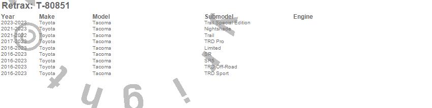 Below is an abbreviated list of applications for the RetraxPRO XR Retractable Tonneau Cover.Tacoma, Toyota, 2023, 2022, 2021, 2020, 2019, 2018, 2017, 2016