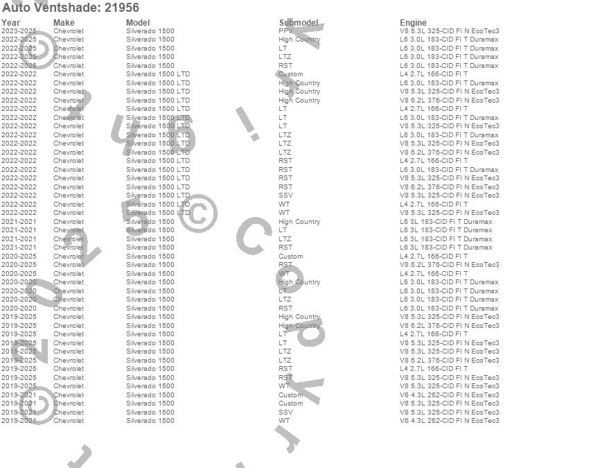 Below is an abbreviated list of applications for the Hoodflector Hood Protector.Silverado 1500, Silverado 1500 LTD, Chevrolet, 2025, 2024, 2023, 2022, 2021, 2020, 2019
