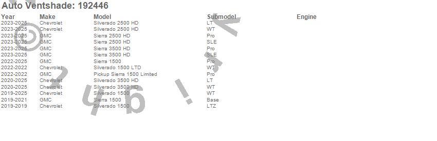 Below is an abbreviated list of applications for the Ventvisor In-Channel Deflector 2 pc..Pickup Sierra 1500 Limited, Sierra 1500, Sierra 2500 HD, Sierra 3500 HD, Silverado 1500, Silverado 1500 LTD, Silverado 2500 HD, Silverado 3500 HD, Chevrolet, GMC, 2026, 2025, 2024, 2023, 2022, 2021, 2020, 2019
