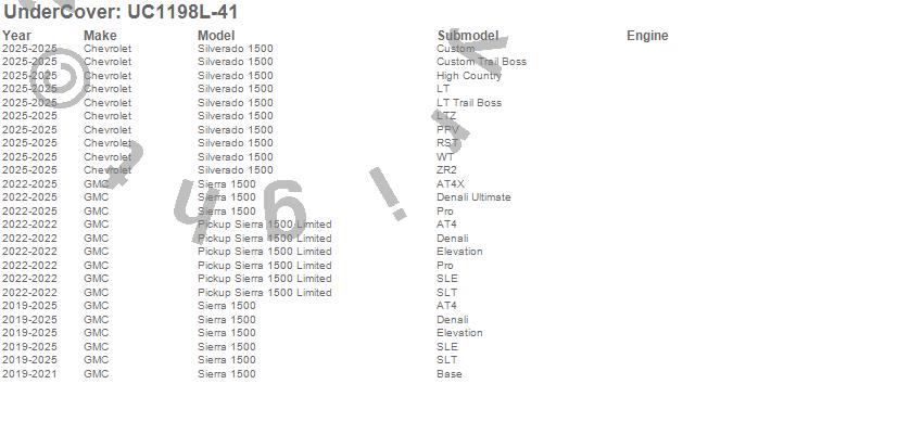 Brand: UnderCoverPart Number: UC1198L-41Tonneau Cover Type: Black - Paint Code GBA/WA8555UPC: 192631020813