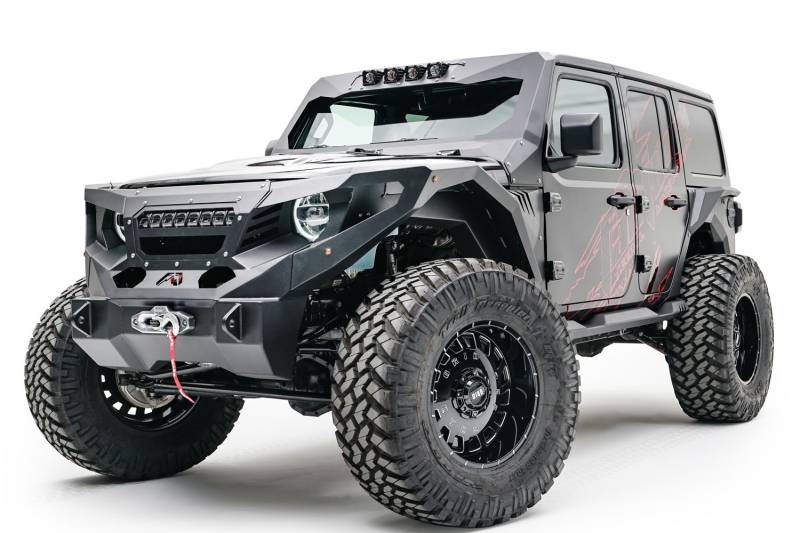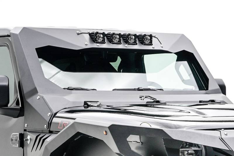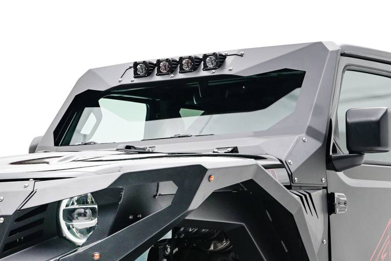 Brand: Fab FoursPart Number: JL3021-1Windshield Light Bracket Type: 11 Gauge Steel Construction - Holds 4- 3 In. X 3 In. Cube Lights - 2 Stage Matte Black Powder Coat w/Epoxy PrimerUPC: 005810116347