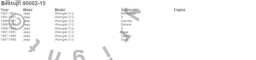 Below is an abbreviated list of applications for the Duster Deck Cover.Wrangler (YJ), Jeep, 1991, 1990, 1989, 1988, 1987